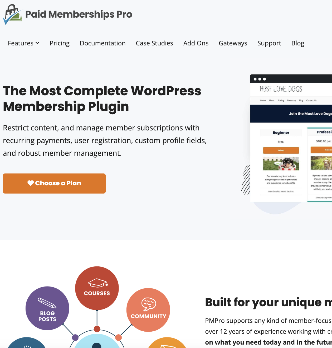 Paid Memberhips Pro hỗ trợ mọi loại hình doanh nghiệp hoặc tổ chức tập trung vào thành viên. Với hơn 12 năm kinh nghiệm làm việc với những người sáng tạo như bạn, plugin này cung cấp những gì bạn cần hôm nay và trong tương lai. Hãy tự mình lựa chọn một trường hợp sử dụng để tìm hiểu thêm về cách xây dựng doanh nghiệp của bạn.